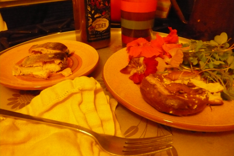 But in a deluded and desirous hope of finding non-cold storage fruit, I headed to the Union Square greenmarket this afternoon. Not lucky there. Instead, I gathered victuals for a fine prandium fit for the locavore set—smoked brook trout, radish sprouts, nasturtiums (a close second to blueberries in the pantheon of my food obsessions), pretzels, and apple cider. Ok. When I abandon the fruit form of apples and citrus, will resort to the juice and cider form for a fix. Today I’ve imbibed about 48 ounces worth.