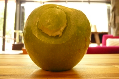 This apple was on display in a bowl at a design shop in Hayes Valley, San Francisco. Somehow it fell, I think on the mouth of a bottle at the other end of the table it was on. Interesting high relief puncture wound. Don’t ask.