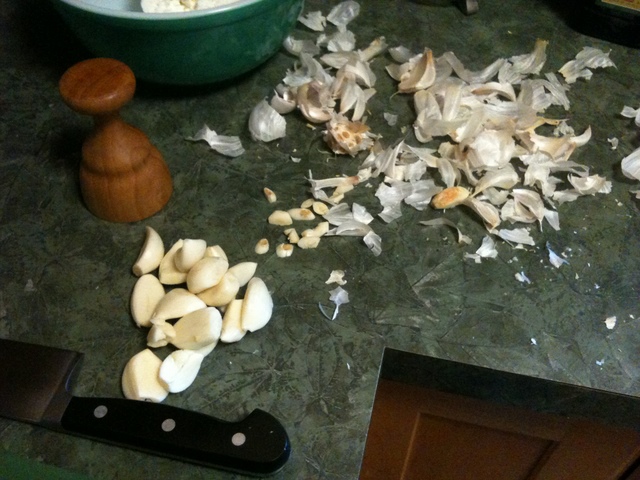 One whole head of garlic outer layers skinned, cloves separated, smashed (not too heavy handed here just enough to work out some fresh-to-resolve romantic frustrations) and freed of their skins to go into a small pot over a slow and low flame atop the stove with little pinches of sel, piper, CRP — quelle surprise!