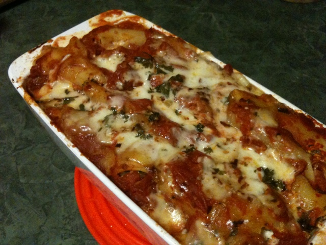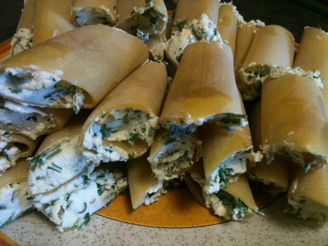 Instead of the usual five or six inch long manicotti shells, I opted to use a *pennoni giganti*. These are about three inches and about an inch or so thick. Dearest Fairway only had the ribbed for eating pleasure manicotti shells which I’m not a fan of. The ribs seem unnecessary to me. I liked the texture of the p. giganti and their pointed ends. It’s really just an aesthetic. Or not.