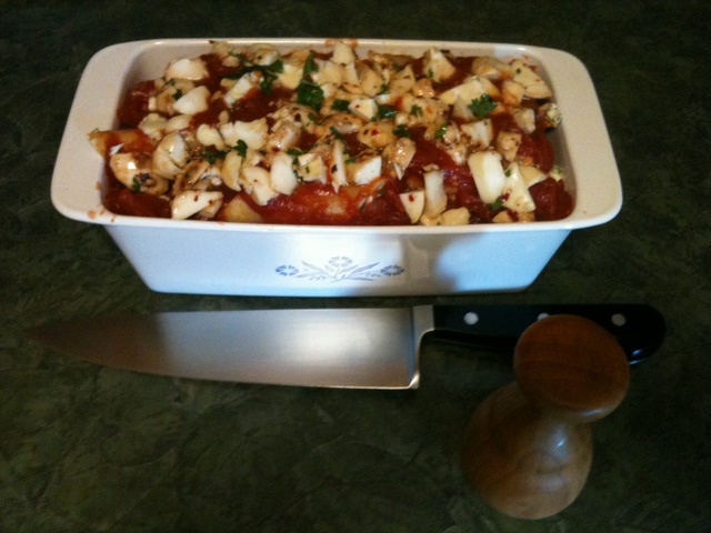 One by one, starting with the green olives, I placed some inside p. gigante, then careful spoons of the ricotta and fine herbs mix into each end. I repeated until all the olives were finished, then did the same with the fry-roast garlic cloves. They are quite soft so I pressed on them into place inside the p. gigante. I did the same with the ricotta, carefully spooning at each end. Once all of the ricotta mix, olives and garlic were finished, I began to build them into the Corning pan. A thin layer of San Marzano tomatoes on the bottom first, lines of alternating olive and garlic p. gigante, more San Marzano tomatoes, another row of p. gigante olive and garlic, another of the San Marzano and a third and last row of the olive and garlic p. gigante — making three layers of p. gigante olive and garlic separated by San Marzano tomatoes — and topped off with the rest of the San Marzano tomatoes. Fairway makes fresh mozzarella balls marinating in the usual suspects: fresh fine herbs, olio, CRP. I chopped about thirteen of these (rule of prime applied here) and made a blanket of these atop everything else.